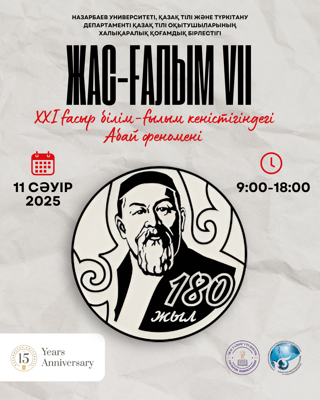 On April 11, 2025, the Department of Kazakh Language and Turkology at Nazarbayev University will hold the national student scientific conference, "Young Scientist – VII." This year's event is dedicated to the 180th anniversary of the renowned Kazakh poet and philosopher Abai Kunanbayev and will explore the theme, "The Abai Phenomenon in the Educational and Scientific Space of the 21st Century."