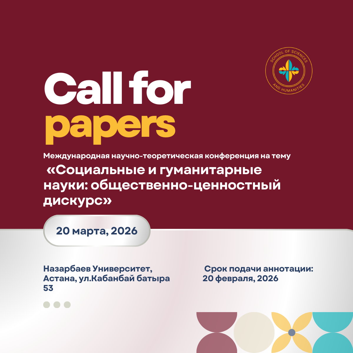 20 марта 2026 года кафедра казахского языка и тюркологии Назарбаев Университета проводит международную научно-теоретическую конференцию на тему «Социальные и гуманитарные науки: общественно-ценностный дискурс». Для участия в конференции приглашаются отечественные и зарубежные ученые, преподаватели высших учебных заведений, ученые научно-исследовательских институтов, а также докторанты и магистранты.